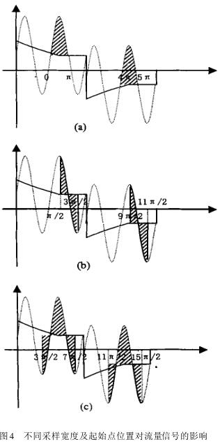 圖4(a)~ (c)直觀地描述了不同采樣寬度及采樣起始點位置對流量信號的影響 。設為信號采樣起始相位角,令為相位差 ;為采樣寬度誤差 都很小 ,可視為無窮小 。圖4(a)的采樣寬度為誤差為