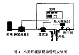 小循環(huán)灌漿法的實質(zhì)是: a泵的吸入量主要由返漿量提供,返漿量的大小由高壓調(diào)節(jié)閥控制,鉆孔灌漿注入量=流量計量(見圖4);b流量計大部分時間工作在1/3量程之下,相當(dāng)長的時間內(nèi)工作在1L/min左右;c返漿漿液不返回攪漿桶,水泥漿液只能在閉合的管道中循環(huán),漿桶內(nèi)調(diào)節(jié)水灰比對灌漿漿液的密度影響甚微。