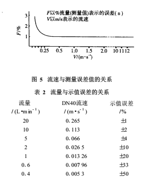 由EMF的測量原理可知,其流量的下限由同噪聲或偏移的信噪比S/N 來決定,其上限則由測量管內(nèi)襯里的磨損和配管的經(jīng)濟速度等來決定。一般當(dāng)測量管內(nèi)實際流速小于0.1m/s時,感應(yīng)電動勢已變得十分微弱(幾微伏至零點幾微伏),此時噪聲的影響逐步變?yōu)橹鲗?dǎo),甚至淹沒信號電動勢。其流速和測量誤差的關(guān)系詳見圖 5和表2。