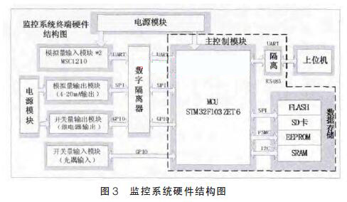 現場浮子流量計監控系統的總體結構如圖2所示。其中硬件系統主要功能是模擬量(溫度、儀表信號)的采集,模擬量(4~20mA 電流)的輸出,開關量的輸入輸出以及遠距離RS485串行通訊和數據存儲。其中監測系統硬件結構如圖3 所示。為增強監測系統的抗干擾能力, 本設計采用帶隔離的電源模塊以及數字隔離器確保系統能夠高效穩定工作。
