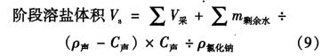 式中:V,為日溶鹽體積,m3; VA為日采鹽體積,m3 ;場余為腔體擴(kuò)大后未排出液體的溶鹽體積,m3 ; Vip1*a為腔體擴(kuò)大后未排出液體體積,m3m剩赫為腔體擴(kuò)大后未排出的液體中等效淡水溶劑質(zhì)量,kg;V排-為日排出液體體積,m3m瑰為日注人液體體積,m3; C排為日排出液體氯化鈉質(zhì)量體積濃度,歲1; C排-為日注人液體氯化鈉質(zhì)量體積濃度,g/l;C注為日排出液體密度,kg/m3 ; p注為日注人液體密度,kg/m3,P氯化鈉為氯化鈉密度,kg/m3 ; p水為水的密度,kg/m3 ; V8為階段溶鹽體積,m3 ; C聲為聲吶測量時腔體內(nèi)氯化鈉質(zhì)量體積濃度,g/1; P聲為聲吶測量時腔體內(nèi)液體密度,kg/m3kg/M。