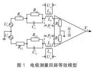 測量電極與流體介質接觸時會發生電化學反應在電極-溶液界面形成阻抗,通常由法拉*阻抗與雙電層電容并聯組成。 法拉*過程分為電荷傳遞過程和擴散過程,相應的法拉*阻抗由電荷傳遞電阻與擴散阻抗串聯組成。一般冷卻水流量計的勵磁頻率大于1Hz,而擴散阻抗發生在更低頻率內,不考慮擴散過程,電極等效阻抗為電荷傳遞電阻與雙電層電容并聯后再與電極接觸電阻串聯。 基于電極阻抗建立的電極等效測量回路如圖 1 所示。圖中:Rs1 和 Rs2 為電荷傳遞電阻;C1 和 C2 為雙電層電容;Rt為兩個測量電極間的接觸電阻滿足 Rt=Rt1+Rt2;Lx 為勵磁線圈等效電感;L1 為閉合回路等效電感;R1 和 R2 為放大器輸入電阻;P1和 P2 為由“變壓器效應”疊加在測量電極上的微分干擾;U1 為流體切割磁力線產生的感應電勢;Ue 為勵磁電壓。 假設磁感應強度由勵磁電流決定且成正比關系即 B=aI,忽略串模等干擾則電極間電壓為感應電勢與微分干擾的疊加,基本方程如下: