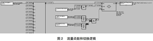 但是由于近期趨勢(shì)可能收集不到部分負(fù)荷段的相關(guān)數(shù)據(jù),在超出現(xiàn)有數(shù)據(jù)負(fù)荷的部分應(yīng)采取必要的補(bǔ)救措施,可以參考相同負(fù)荷運(yùn)行的另一臺(tái)余熱鍋爐的主蒸汽流量,以此來(lái)彌補(bǔ)現(xiàn)有數(shù)據(jù)的不足。為了保證數(shù)據(jù)切換的可靠性,切換條件要嚴(yán)謹(jǐn),現(xiàn)有函數(shù)的負(fù)荷下線上增加25MW與另外一臺(tái)的燃機(jī)負(fù)荷大于100MW。如此設(shè)置的好處是當(dāng)另一臺(tái)運(yùn)行機(jī)組突然故障或跳機(jī)時(shí)保證數(shù)據(jù)能及時(shí)切換到函數(shù)輸出,保證機(jī)組的安全運(yùn)行。具體操作見(jiàn)圖2。