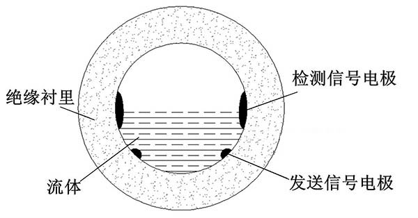 ①多電極式非滿管工業污水流量計。其底部是一對信號注人電極,中間有多對測量電極,頂端有一個滿管電極。在滿管情況下,該流量計與普通的工業污水流量計的功能相同,滿管情況下流體的橫截面積是固定的,此時計算流量值只需要測量流體的流速即可。當流體非滿管時,滿管電極檢測到管道非滿狀態,利用算法修正測量值,此時流量計的測量方式改成測量流體流速和液面高度。信號注人電極與在不同位置的三對測量電極共同工作,用于測量液位面的高度和流體的速度。多電極式非滿管工業污水流量計結構簡圖如圖3所示。