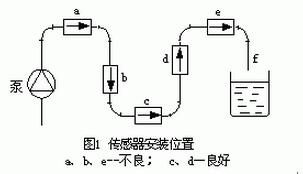 水平安裝時要使電極軸線平行于地平線,不要處于垂直于地平線,因為處于底部的電極易被沉積物覆蓋,頂部電極易被液體中偶存氣泡擦過遮住電極表面,使輸出信號波動。圖1所示管系中,c、d為適宜位置;a、b 、e為不宜位置,b處可能液體不充滿,a、e處易積聚氣體,且e處傳感器后管段短也有可能不充滿,排放口*好如f形狀所示。對于固、液兩相流c處亦是不宜位置。