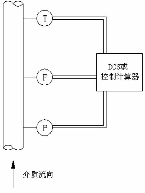流量計、溫度變送器、壓力變送器單獨安裝,流量信號、溫度信號、壓力信號分別輸入DCS或控制計算器進行流量的溫度、壓力補償計算,完成流量、壓力、溫度各參數的顯示、輸出、打印等功能。此種結構安裝靈活,特別適用于現場流量計的升級改造,如圖2所示。號、溫度信號、壓力信號輸入到溫壓補償功能設計的流量計轉換器中,進行流量的溫度、壓力補償計算,完成流量、壓力、溫度各參數的顯示、輸出、打印等功能。此種結構測量準確度高,體積小,安裝方便,如圖3所示: