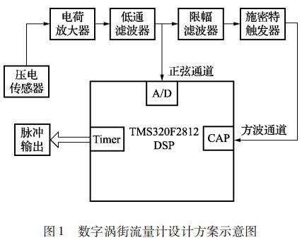 本文設(shè)計的基于 TMS320F2812 DSP 的數(shù)字二氧化碳流量計的信號處理系統(tǒng)由前置放大電路和數(shù)字信號處理電路兩部分組成。本文選用的前置放大電路即為目前被廣泛應(yīng)用的普通二氧化碳流量計的前置放大電路,主要由電荷放大電路、低通濾波電路、限幅濾波電路和施密特觸發(fā)電路組成; 對于經(jīng)壓電傳感器測得的渦街信號采用了頻域分析和時域分析相結(jié)合的方式,即由前置放大電路和數(shù)字信號處理電路相配合。時域分析通道利用 DSP 事件管理器的捕獲模塊,對前置放大電路輸出的方波進行頻率計算,然后再由 DSP 事件管理器通用定時器的比較輸出模塊進行脈沖輸出。頻域分析通道即 DSP對低通濾波電路輸出的疊加了許多噪聲的正弦信號進行 A/D 采樣,再利用 DSP 對 A/D 采樣的結(jié)果進行頻譜分析,從而得出此時渦街信號的頻率,*后由 DSP 通用定時器的比較輸出模塊進行脈沖輸出。系統(tǒng)設(shè)計方案示意圖如圖 1 所示。