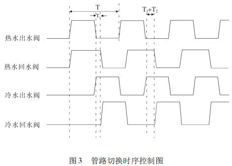 開始試驗,冷熱水箱預先達到試驗要求溫度,水泵運轉調節管路流量至設定值。系統給定信號控制四個開關閥(熱水出水閥、熱水回水閥、冷水出水閥、冷水回水閥) 的打開與關閉,實現冷熱水的切換。熱水沖擊時,熱水出水閥與熱水回水閥打開的同時,冷水出水閥與冷水回水閥關閉,確保試驗管路熱水沖擊;同理,冷水沖擊時,冷水出水閥與冷水回水閥打開,熱水出水閥與熱水回水閥關閉,確保試驗管路冷水沖擊。系統通過四個開關閥對管路進行時序控制,達到管路切換的目的,很好地實現了 4000次冷熱循環沖擊試驗。其具體的管路切換控制時序圖如圖 3 所示。