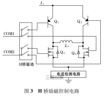 由圖 3 可知,I o 為高低壓切換恒流控制電路輸出的恒流源電流,H 橋驅動的 COM1 端控制三極管 Q 1和場效應管 Q 4 的通斷;COM2 端控制三極管 Q 2 和場效應管 Q 3 的通斷。L 1 表示的是勵磁線圈(傳感器中線圈),COM1、COM2 為正交的 PWM 波信號,因此在勵磁線圈 L 1 的兩端會產生方波勵磁信號。檢流電路主要是用來檢測勵磁線圈中電流的變化,當線圈中的勵磁電流方向變化時,可以及時將此信息反饋給高低壓切換恒流控制電路中的比較器,從而實現切換高低壓源達到恒流控制的目的。
