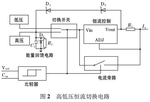 高頻勵磁電路主要由高低壓切換恒流控制電路和H 橋勵磁開關電路組成。其中高低壓切換恒流控制電路確保高壓或低壓情況,都可以通過 H 橋向勵磁線圈提供恒定的電流。電路原理圖如圖 2所示。
