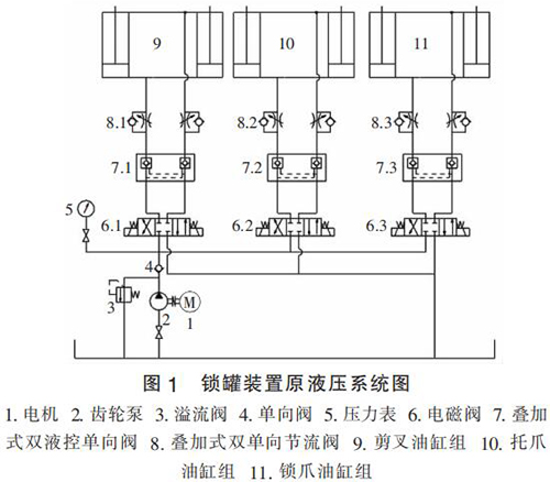 氪氣流量計原液壓系統(tǒng)圖如圖 1 所示。 通過分析圖 1 發(fā)現(xiàn),原液壓系統(tǒng)中剪叉油缸組、托爪油缸組及鎖爪油缸組并聯(lián)安裝,并均由齒輪泵供油,該系統(tǒng)設(shè)計簡單,液壓元件選擇不夠合理,工作效率低,電機發(fā)熱大,主要存在的問題: