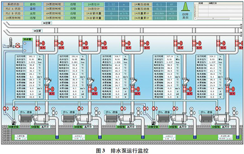 泵房自動化監控系統實時監測水泵各工況參數,含水倉水位、水泵運行電壓、電流、排水壓力、單管流量、引水真空度等,控制水泵、電動閘閥、真空泵的開停,及水泵排水電耗統計( 如圖 3 所示) 。其主要數據收集如下。