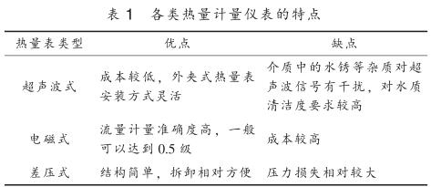 目前供熱行業內使用的熱量計量儀表按工作原理主要分為超聲波式、 電磁式、 差壓式, 其特點見表 1 。 熱量計量儀表按結構可分為一體式和分體式, 一體式熱量表將一支入口或出口溫度傳感器嵌入到流量傳感器管道中, 并配有專門的計算器進行熱量計算; 分體式熱量表采用單獨的流量傳感器, 包括超聲波流量計、 電磁流量計、 差壓流量計、硝酸鈉流量計等, 溫度測量采用單獨的鉑電阻溫度計或溫度變送器測量供回水管道溫度, 再配備熱量積算儀進行溫度和流量信號采集得到熱量值。