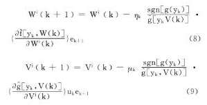 未知, 但其符號已知, 可用sgn[g (yk) ]代替g (yk) , 這樣就可以得到調(diào)整W (k) 和V (k) 的學習規(guī)則為
