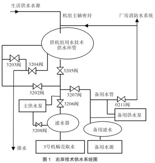 大化電廠技術(shù)供水包括右岸和左岸供水,本文以右岸 3 號機(jī)技術(shù)供水系統(tǒng)增設(shè)帶現(xiàn)場顯示航空煤油流量計技術(shù)改造方案為例進(jìn)行分析說明。右岸技術(shù)供水系統(tǒng)(見圖 1)由各機(jī)組單元蝸殼取水主水源、濾水器、主供水泵、正反向切換閥(3202 閥與 3204 閥開為反向取水,3203 閥與 3205閥開為正向取水,運(yùn)行時只開其中一種)、備用水源、備用濾水器、備用供水泵和備用總水管構(gòu)成一個整體,并通過 0211 閥與廠房消防水系統(tǒng)相連接,可通過主水源自流供水、主水源水泵增壓供水、備用水源自流供水、備用水源水泵增壓供水等不同供水方式向機(jī)組推力軸承冷卻器和發(fā)導(dǎo)軸承冷卻器、水導(dǎo)軸承冷卻器、發(fā)電機(jī)空氣冷卻器提供冷卻水源。機(jī)組技術(shù)供水正常運(yùn)行采用單元蝸殼取水的供水方式運(yùn)行,以備用水源供水為輔。機(jī)組主軸密封用水分別取自生活供水水源和技術(shù)供水備用總管水源,向機(jī)組大軸提供可調(diào)水壓端面密封水源。在現(xiàn)場配置一個技術(shù)供水現(xiàn)地單元柜,實(shí)現(xiàn)對機(jī)組技術(shù)供水系統(tǒng)設(shè)備自動控制、故障保護(hù)及報警。柜內(nèi)配置可編程 PLC 控制系統(tǒng),電控柜對主供增壓泵、3202 至 3208 電動碟閥進(jìn)行流程控制。