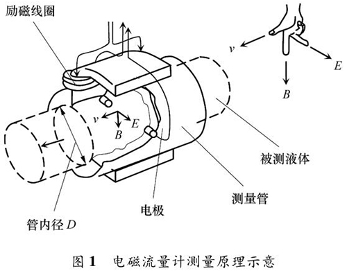 乙醇管道流量計的測量原理如圖 1 所示。根據法拉*電磁感應定律,導電液體在磁場中流動會產生電動勢 E,它與磁感應強度 B、導電液體平均流速 v 成一定比例關系: