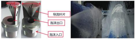 圖 1 為電弧風扇噴嘴的結構和噴霧,一種新型的噴嘴主要由一個過熱蒸汽渦街流量計入口、出口和導流葉片組成。出流口的圓柱形設計降低了湍流強度。導流葉片類似于流線型尾部,產生類似于弧形風扇形狀的過熱蒸汽渦街流量計噴霧,其形狀類似于掘進機的粉塵源。