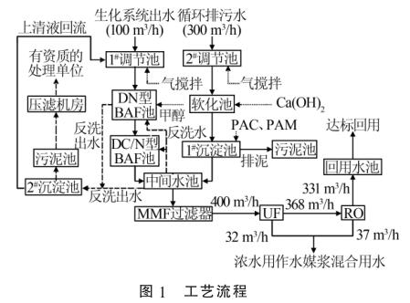 2種廢水在中間水池混勻后,通過泵提升進入保安過濾器,進一步去除細小的懸浮物后經過增壓泵進入超濾膜(UF)處理系統和反滲透(RO)系統,然后通過渦輪流量計進行計量。反滲透出水直接進入回用水池達標回用,超濾濃水以及反滲透濃水用作水煤漿混合用水。污泥池中的污泥通過泵打入帶式機壓濾處理,濾液自流進入1#調節池。工藝流程見圖1。