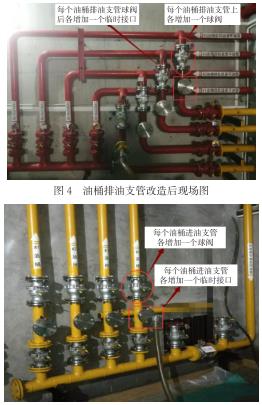 (1)改造后,各個油桶的油處理工作實現(xiàn)互不影響的效果。油桶排油支管的臨時接口兩端的球閥都是近油桶側(cè)的閥門,油桶進(jìn)油支管的臨時接口ding部的球閥為近油桶側(cè)的閥門。油桶需進(jìn)行油過濾工作時,僅需將濾油機(jī)的進(jìn)油管接在該油桶排油支管新增的臨時接口上,同時濾油機(jī)的出油管連接在該油桶進(jìn)油支管新增的臨時接口上,然后分別打開進(jìn)油支管和排油支管新增臨時接口ding部的近油桶側(cè)球閥,即可開始形成循環(huán)油路進(jìn)行油桶內(nèi)的透平油過濾。同時未改變各個油桶中透平油的互相倒換、轉(zhuǎn)移功能。