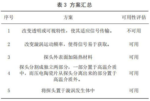 3)查找沖突矩陣,得到如下發明原理:No.32 改變顏色、No.19 周期性作用、No.24 中介物。方案一:依據No.32 改變顏色發明原理,得到解如下:改變透明或可視特性,使其適應信號傳輸。方案二:依據 No.19 周期性作用,得到解如下:改變漩渦運動頻率,使得信號易于獲取。方案三:依據 No.24中介物,得到解如下:探頭外表面加真空絕熱材料。
