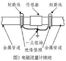 (4)盡量避開振動(dòng)源、磁源(大功率電機(jī)、變壓器)由于智能渦輪流量計(jì)的測(cè)量感應(yīng)電壓很小,電壓較低,易受外界電磁噪聲的影響,故在安裝時(shí)應(yīng)進(jìn)行可靠的接地連(跨)接。金屬管道智能渦輪流量計(jì)接地連(跨)接方法如圖3所示