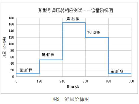 該測試主要利用實(shí)驗(yàn)室測試條件,模擬客戶現(xiàn)場使用情況。其主要測試內(nèi)容包括:測試電磁流量計(jì)在+23℃,-30℃和-40℃三種溫度下,電磁流量計(jì)出口壓力分別在2.1kPa和30kPa時(shí),流量分別從*1階梯到*5階梯時(shí)的響應(yīng)速度,客戶所提供的流量階梯如圖2所示。橫軸表示下游球閥開啟動(dòng)作時(shí)間,縱軸表示高溫電磁流量計(jì)下游需要的流量q。