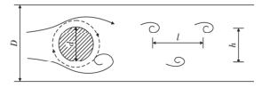 渦街氣體流量計(jì)是由漩渦發(fā)生體、頻率檢測器和信號(hào)轉(zhuǎn)換器等環(huán)節(jié)組成,輸出 4 ~ 20 mADC 信號(hào)或脈沖電壓信號(hào)。其測量原理是在流動(dòng)的流體中的垂直流動(dòng)方向安放 1 根或多根非流體型阻流體,在一定的流量范圍內(nèi),流體在阻流體兩側(cè)交替地分離、釋放出 2 串頻率正比于管道內(nèi)的平均流速、規(guī)則的、不對(duì)稱有規(guī)律的交替漩渦列,如圖 1 所示,且兩側(cè)漩渦旋轉(zhuǎn)方向相反 。采用檢測元件測出漩渦頻率就可以推算出流體的流量。
