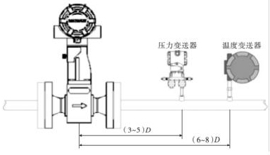 渦街氣體流量計(jì)的口徑如果與工藝管道相同,不能滿足流量儀表要求時(shí),或者在此流速下測量準(zhǔn)確度不能保證時(shí),需要縮小儀表口徑,從而提高管內(nèi)流速,保證測量精度。上下游必須有足夠的直管段,若傳感器安裝點(diǎn)的上游在同一平面上有 2 個(gè) 90°彎頭時(shí),上游直管段≥25D,下游直管段≥5D。根據(jù)測量的需要,需在渦街氣體流量計(jì)附近測量壓力和溫度時(shí),測壓點(diǎn)應(yīng)在傳感器下游的(3 ~5)D 處,測溫點(diǎn)應(yīng)在傳感器下游的(6 ~8)D 處,如圖 3 所示。