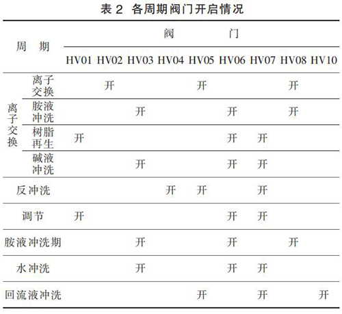 5)回流沖洗周期。 胺液每天都需取樣化驗(yàn),如果發(fā)現(xiàn)胺液中有不溶或懸浮的過渡金屬聚集,則每天運(yùn)行周期結(jié)束后需利用回流液對樹脂進(jìn)行清洗,以防止腐蝕和樹脂損壞。 如果選擇了此選項(xiàng),PLC程序會在每天完成目標(biāo)數(shù)量的離子交換周期后,自動執(zhí)行回流液清洗周期。 各周期閥門對應(yīng)開關(guān)情況,如表 2 所示。