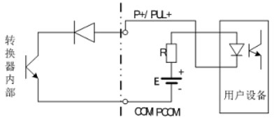 PUL+/ P+、ALM+(AH)、ALM-(AL)和 PDIR(FDIR)均為集電極開路(OC 門)輸出(參閱圖 3.6b、3.6d,用戶接線時必須參照如下電路外接電源和負(fù)載:
