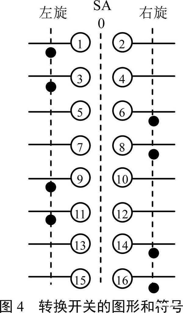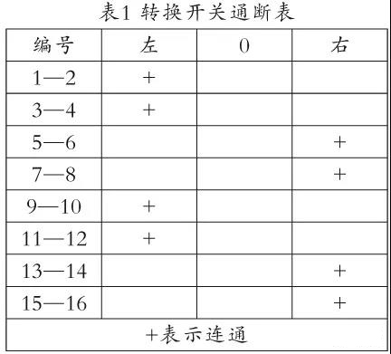 圖4是一款轉(zhuǎn)換開關(guān)的圖形和符號(hào),表1是它在左旋和右旋兩個(gè)部位時(shí)8個(gè)開關(guān)對(duì)應(yīng)的通斷情況。