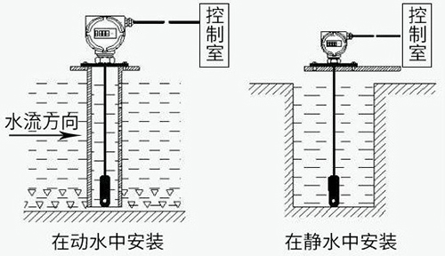 投入式靜壓液位計(靜壓式水位計)通常投入直徑大于水位計直徑的的PVC管、鋼管,管道固定在水中,不同高度打若干小孔,以便水通暢進入管內。或者在底部加裝阻尼裝置,以過濾泥沙和消除動態壓力和波浪對測量的影響。