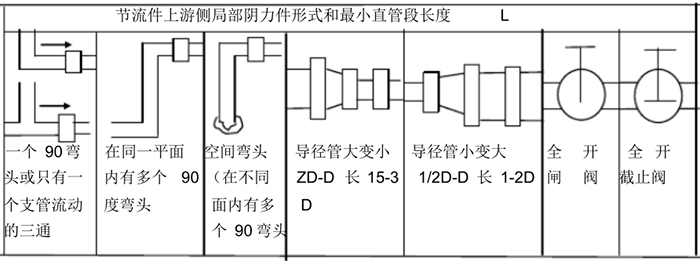節(jié)流裝置的安裝和適用于下列管段和管件有關:節(jié)流件上游側(cè)*一阻力件、*二阻力件,節(jié)流件下右側(cè)*一阻力件,從節(jié)流件上游*二阻力件到下游*一阻力件之間的管段以及差壓訊號管路等。