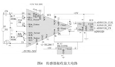 IC2(SL28617)放大器用于放大傳感器送來)放大器用于放大傳感器送來的反映流量大小的電壓信號,圖中的反映流量大小的電壓信號,圖中Rin和Rfb是用來改變運算放大器增益的電阻。來改變運算放大器增益的電阻。S1是勵磁信號源,R17、R18是輸入偏置電阻,運放的是輸入偏置電阻,運放的9腳和16腳分別接電源±腳分別接電源±5V,接在運放IC2輸出端的IC3(ADS8320 ADS8320)是16位高速A/D轉換器,其轉換速度可達16kHz/s,接在接收放大器與接在接收放大器與A/D轉換器之間的IC12(ISL21090 ISL21090)是三端穩壓器。電路如圖)是三端穩壓器。電路如圖4所示。