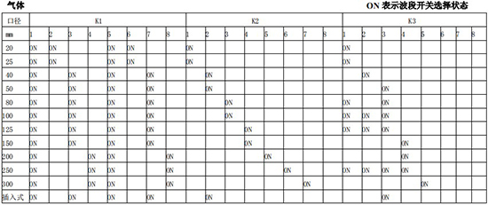 以上表值僅供參考,實際使用中因液體粘度和氣體密度不同應在此值附近調整,頻率低時可將 K3 向大口徑方向調一至三檔。頻率高時可將 K2 向小口徑方向調一至三檔。